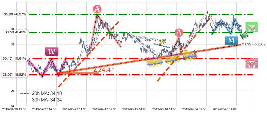 ♘ 阻力价格位35.90,可信任强度80.67%,距离最后交易2019-07-31 15:00形成的收盘价格33.75相差 +6.37%