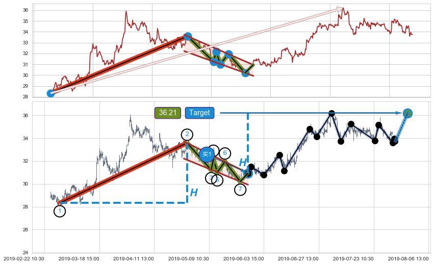➣ 降旗形:猜想预期上涨目标target即将达成,随后猜想强阻力来临,预期回调下跌(均值回复)