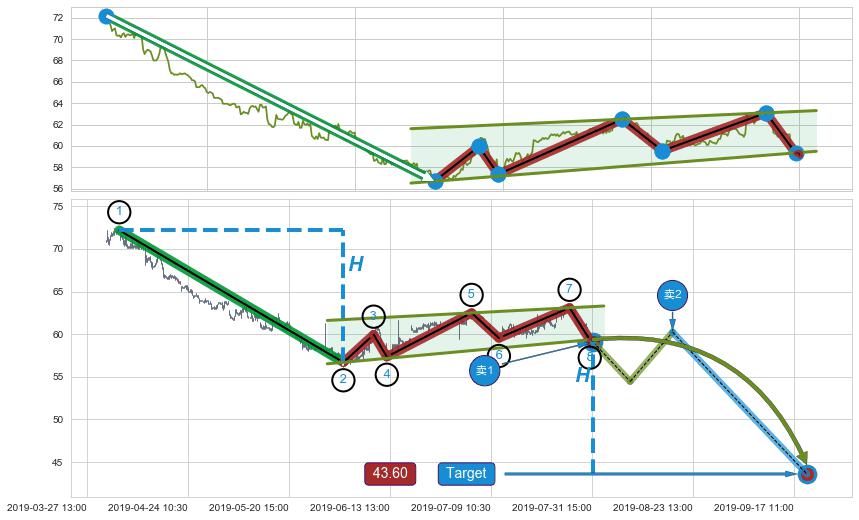 从2019-04-03 15:00至2019-05-31 15:00,共包含223个小时,阶段股价下跌-23.87%,阶段股价变动位移路程比: 1 : 3