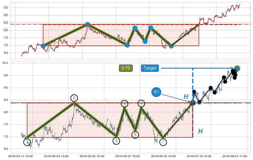 ➣ 上涨矩形整理:猜想预期上涨目标target即将达成,随后猜想强阻力来临,预期回调下跌(均值回复)