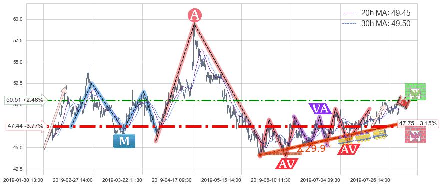 ♘ 支撑价格位47.44,可信任强度99.93%,距离最后交易2019-07-31 15:00形成的收盘价格49.30相差 -3.77%