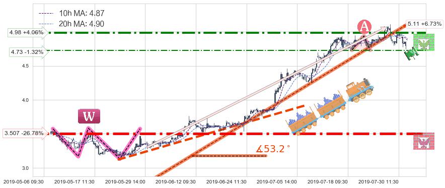 从2019-05-23 10:30至2019-07-31 11:30,共包含284个小时,阶段股价上涨43.60%,阶段股价变动位移路程比: 1 : 4,上涨趋势角度: 53.2