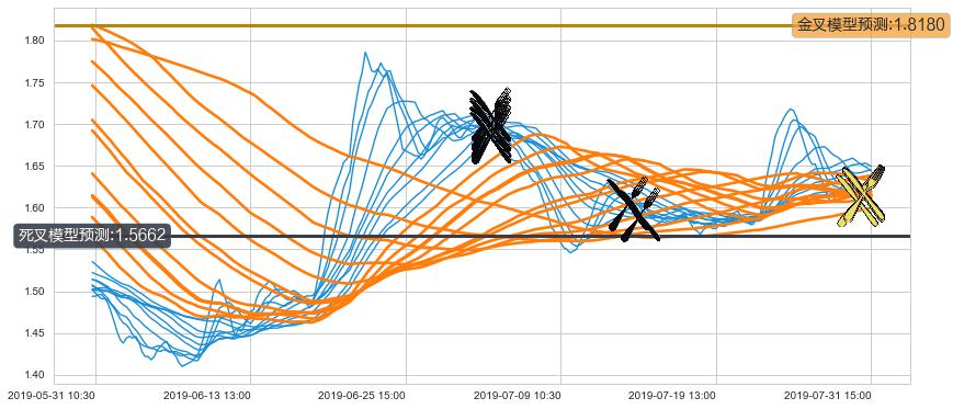 ➣ 45小时均线于(07-03 11:30: 1.7098)形成【死叉】基于【死叉历史模型】预测死叉后最低波谷价格: 1.6527, 死叉后最低价格1.5400,已经下跌超出预测最低波谷价格, 预期反弹