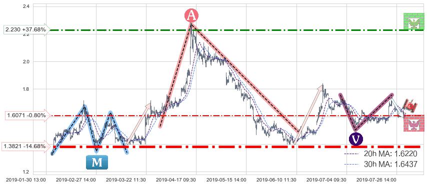 ♘ 阻力价格位2.230,可信任强度56.32%,距离最后交易2019-07-31 15:00形成的收盘价格1.6200相差 +37.68%