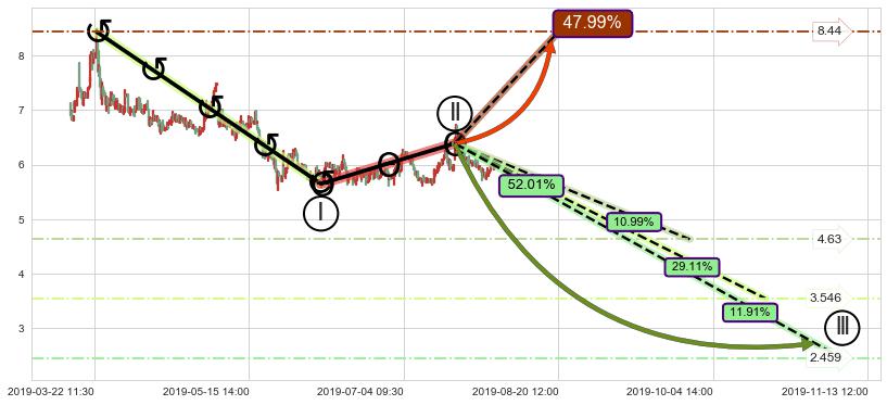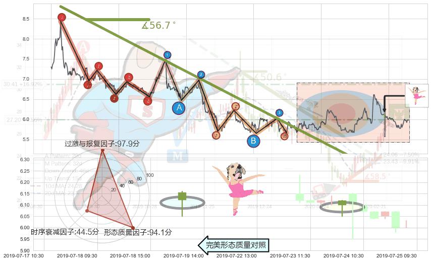从2019-03-22 15:00至2019-06-24 15:00,共包含361个小时,阶段股价下跌-34.15%,阶段股价变动位移路程比: 1 : 9,下跌趋势角度: 56.7