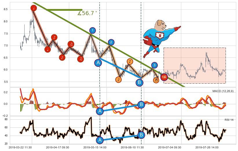 从2019-05-03 15:00至2019-06-24 15:00,共包含205个小时,阶段股价下跌-23.29%,阶段股价变动位移路程比: 1 : 8,下跌趋势角度: 58.1
