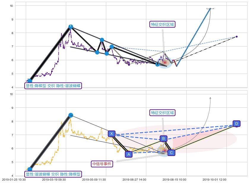 ➢ 谐波蝴蝶:b下跌接近c:猜想支撑性拉升 → 上涨 →【拐点】支撑临近 → 大趋势均值回复