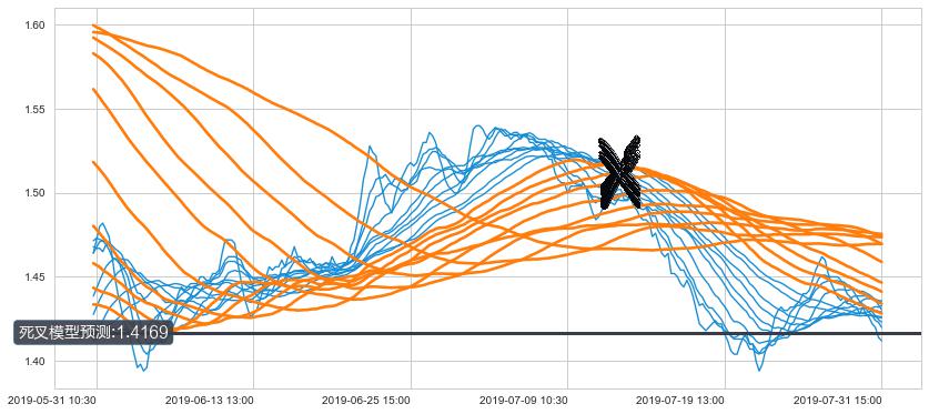 ➢ 40小时均线于(07-11 15:00: 1.5130)形成【死叉】基于【死叉历史模型】预测死叉后最低波谷价格: 1.4294, 死叉后最低价格1.3800,已经下跌超出预测最低波谷价格, 预期反弹