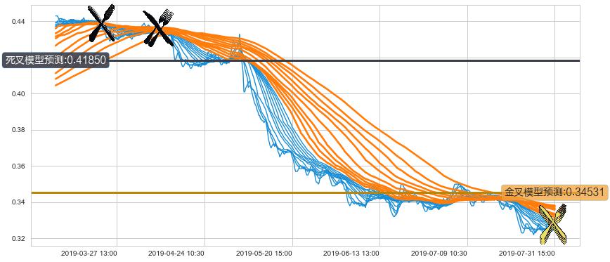 ➣ 70小时均线于(03-22 11:30: 0.43950)形成【死叉】基于【死叉历史模型】预测死叉后最低波谷价格: 0.42632, 死叉后最低价格0.32000,已经下跌超出预测最低波谷价格, 预期反弹