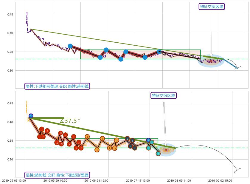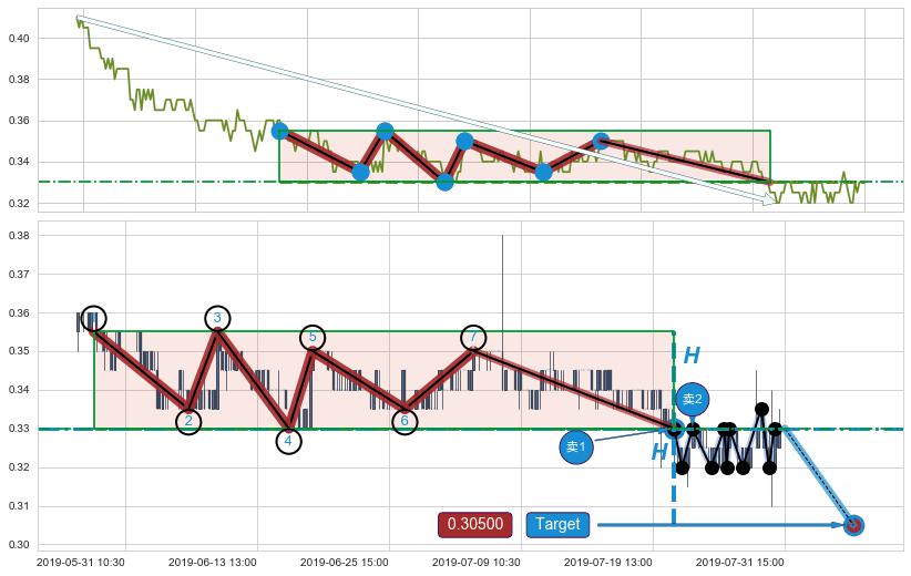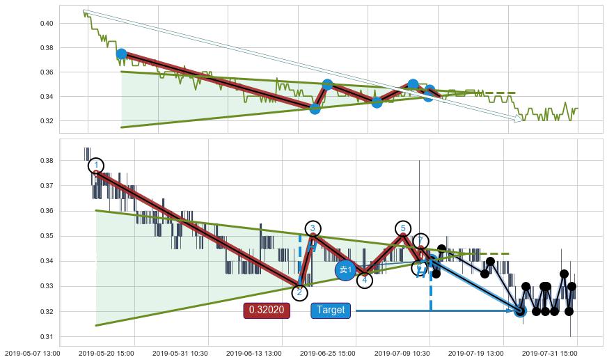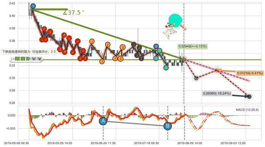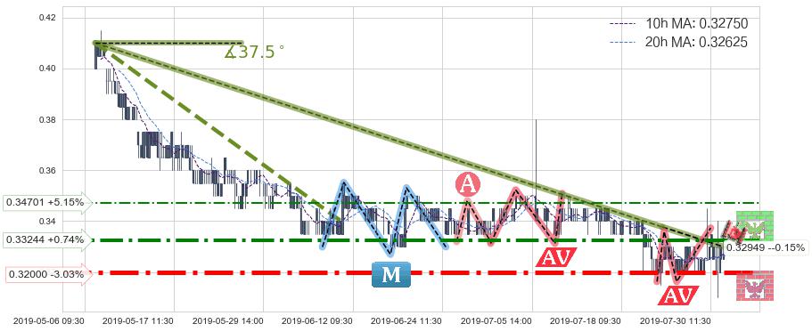 🦴 长线均值回复组合短线趋势跟踪[强阻力信号]2019-05-07 09:30-2019-07-23 15:00下跌趋势依然成立(下跌趋势跟踪依然存在),短线价格略微上行反弹(均值回复猜想),即将接近下跌趋势提供的未破位阻力价格:0.32949。