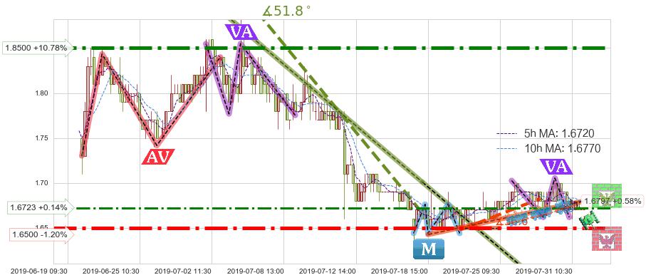 ➢ 2019-07-18 15:00-2019-07-30 15:00上升趋势存在反转[风险],虽然原上升趋势的支撑位(1.6797)已破位,但其支撑效果尚存,原上升趋势角度: 36.6˚
