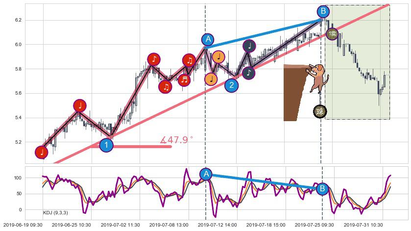 ✂️ 2019-06-19 09:30-2019-07-26 13:00上升趋势存在反转[风险],其原上升趋势的支撑位(6.33)已破位[强阻力信号],原上升趋势角度: 47.9˚