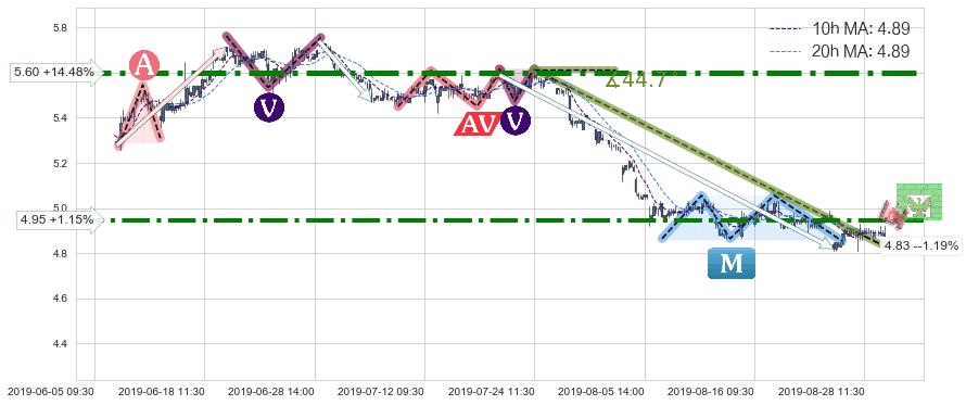 从2019-07-24 11:30至2019-08-27 14:00,共包含147个小时,阶段股价下跌-13.16%,阶段股价变动位移路程比: 1 : 3,下跌趋势角度: 44.7