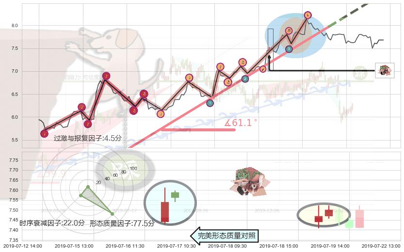 从2019-07-09 09:30至2019-07-25 14:00,共包含77个小时,阶段股价上涨23.51%,阶段股价变动位移路程比: 1 : 3,上涨趋势角度: 55.5