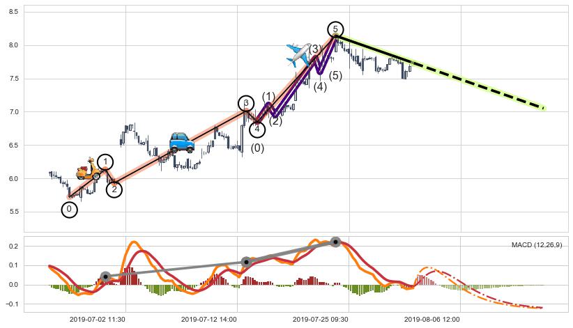 ➣ 波浪理论:猜想达到c点后小反弹终止反转下跌 → 下跌 → 【拐点】临近 → 阶段均值回复结束后继续大周期趋势跟踪