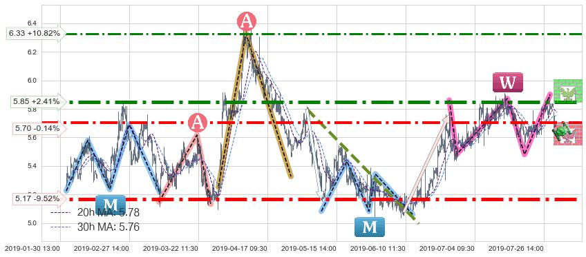 ♘ 阻力价格位5.85,可信任强度90.35%,距离最后交易2019-07-31 15:00形成的收盘价格5.71相差 +2.41%