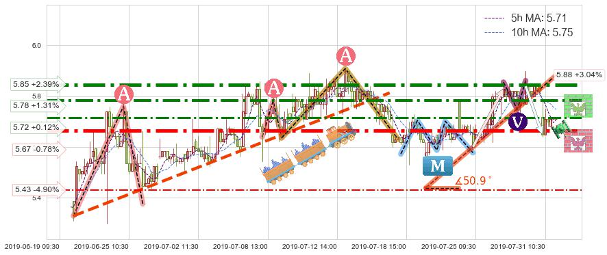 ♘ 阻力价格位5.85,可信任强度87.24%,距离最后交易2019-07-31 15:00形成的收盘价格5.71相差 +2.39%