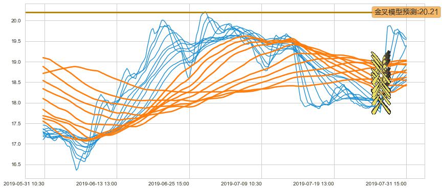 ➣ 70小时均线于(07-26 15:00: 18.23)形成【金叉】基于【金叉历史模型】预测金叉后最高波峰价格: 20.06, 金叉后最高价格20.10,虽然已经到达预测最高波峰价格,但耗时间很短动能很强, 预期继续上涨