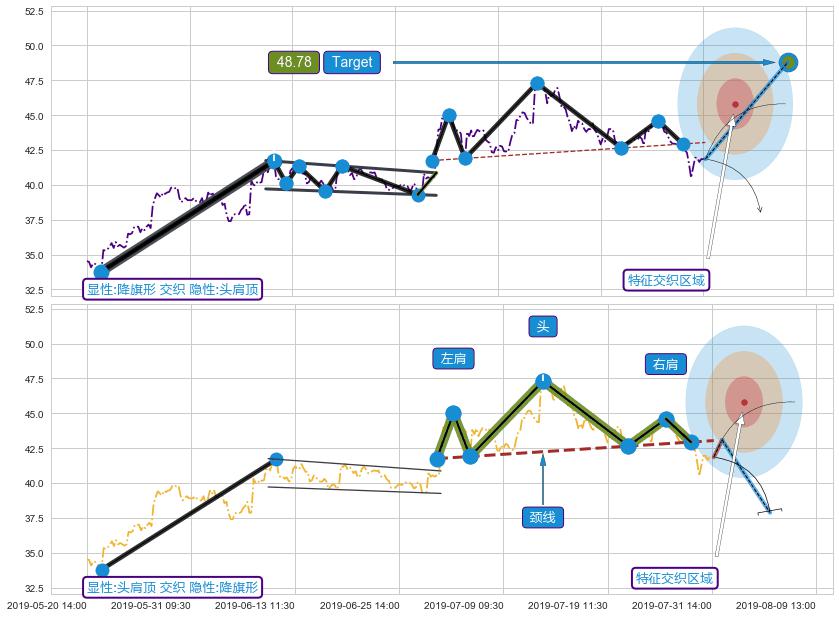 ➣ 射击之星形态 + 降旗形临近target阻力拐点下跌信号叠加后【信号初始稳固度】中等,【看空】信号叠加【可信度影响中等】