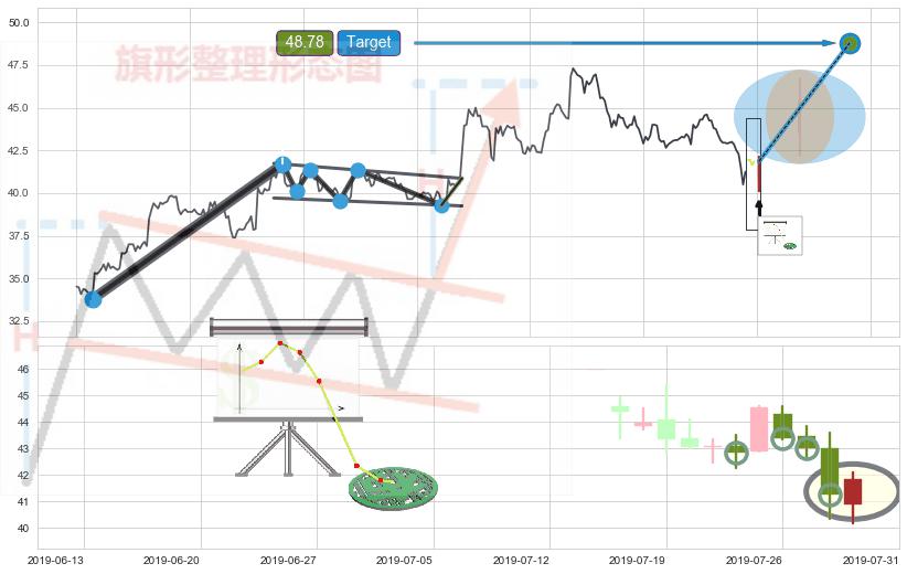 ➣ 降旗形:猜想预期上涨目标target即将达成,随后猜想强阻力来临,预期回调下跌(均值回复)