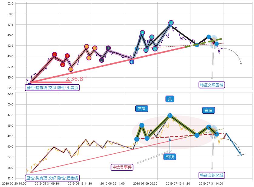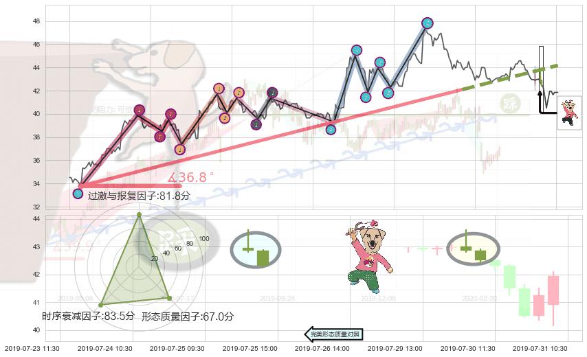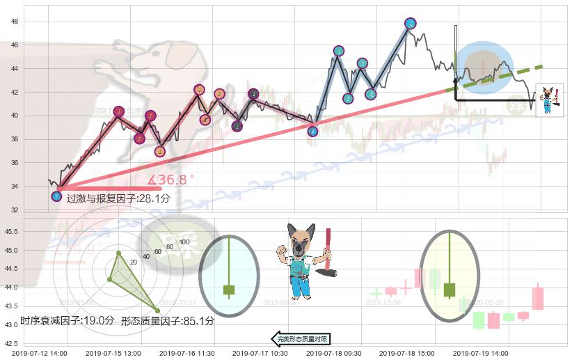 ➢ 2019-05-21 15:00-2019-07-18 09:30上升趋势存在反转[风险],其原上升趋势的支撑位(44.18)已破位[强阻力信号],原上升趋势角度: 36.8˚