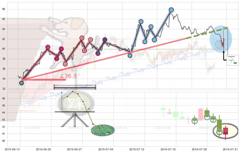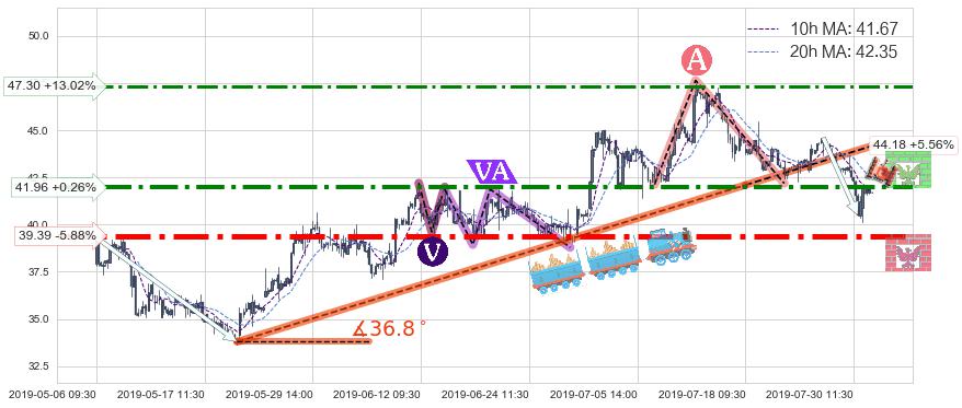 ➣ 2019-05-21 15:00-2019-07-18 09:30上升趋势存在反转[风险],其原上升趋势的支撑位(44.18)已破位[强阻力信号],原上升趋势角度: 36.8˚