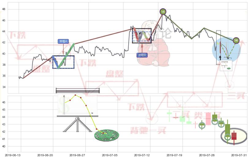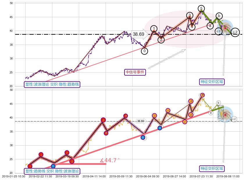 从2019-07-08 14:00至2019-07-23 09:30,共包含63个小时,阶段股价上涨1.22%,阶段股价变动位移路程比: 1 : 39