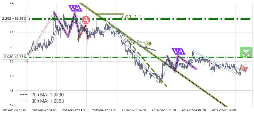 ♘ 阻力价格位2.292,可信任强度93.61%,距离最后交易2019-07-31 15:00形成的收盘价格1.9200相差 +19.39%