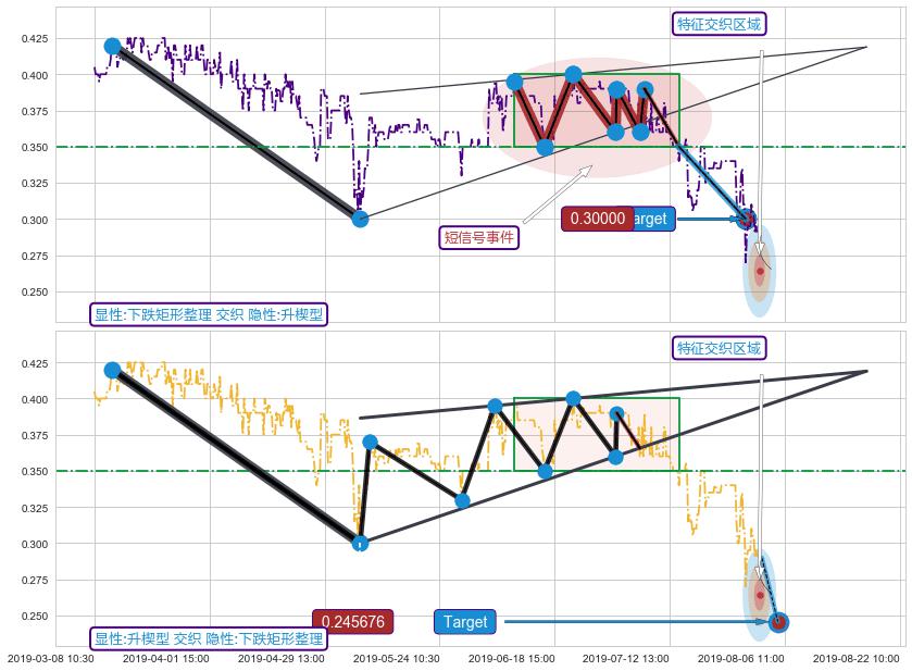 ➢ 下跌矩形整理属【短级别信号事件】下降对称三角整理属【长级别信号事件】长短周期组合信号事件, 短长事件长度比35.47%