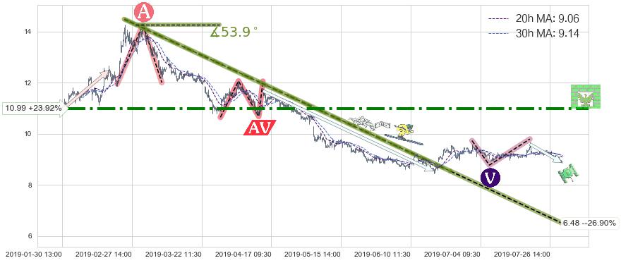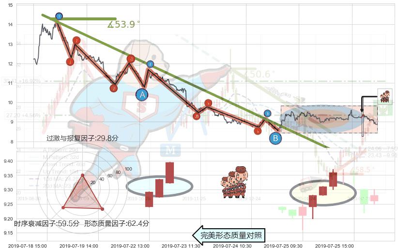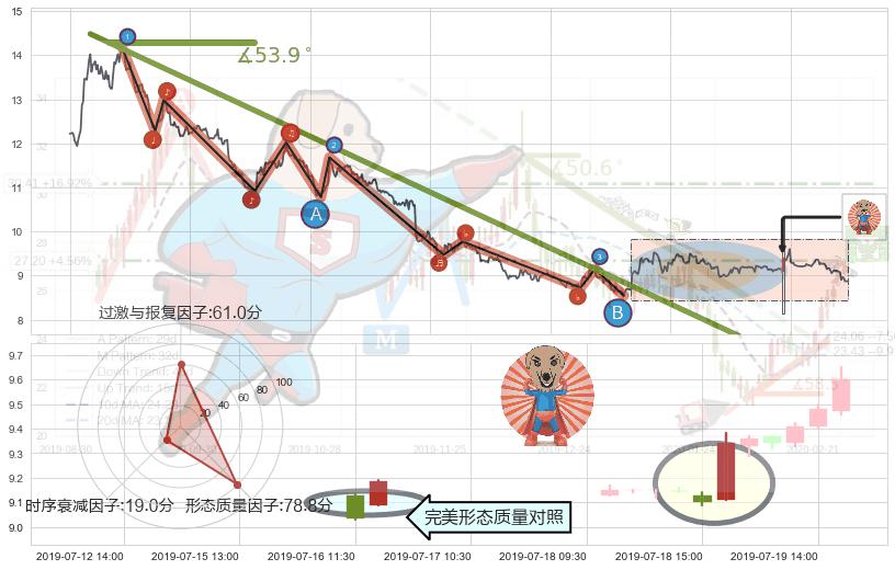 从2019-02-25 15:00至2019-06-21 15:00,共包含469个小时,阶段股价下跌-39.62%,阶段股价变动位移路程比: 1 : 7,下跌趋势角度: 53.9