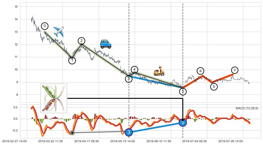 ➣ 波浪理论:猜想达到c点后小反弹终止反转下跌 → 下跌 → 【拐点】临近 → 阶段均值回复结束后继续大周期趋势跟踪