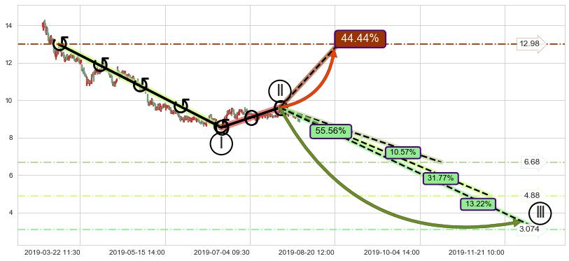 ➣ 调整浪已超过预测的c点位置,后续大趋势循环浪继续下跌概率55.56%,谨慎做多