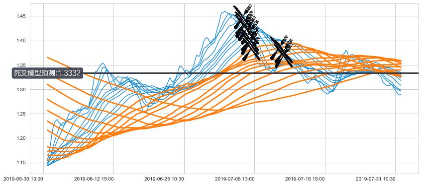 ➢ 80小时均线于(07-11 11:30: 1.3844)形成【死叉】基于【死叉历史模型】预测死叉后最低波谷价格: 1.3250, 死叉后最低价格1.2800,已经下跌超出预测最低波谷价格, 预期反弹