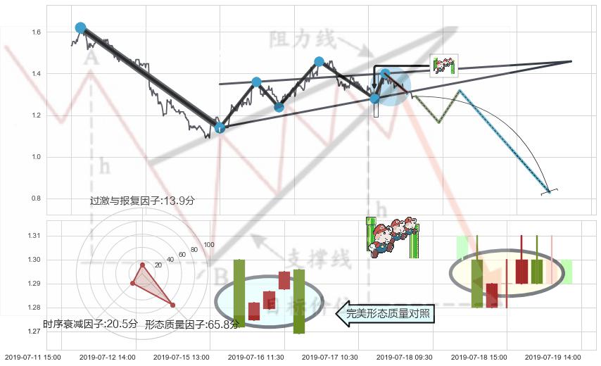 ➢ 🕰 价格走势在2019-07-18 13:00:00至2019-07-19 10:30:00期间形成下降三部曲(降势三鹤),残存影响值:-2.18