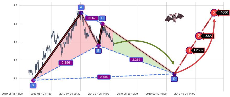 ➢ 距离预测D点位置尚有下跌空间,短线依然【看跌】, 耐心等待看涨【蝙蝠】形态反转启动