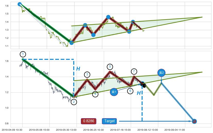 ➣ 升楔型:关键支撑位被击穿 → 猜想形成趋势持续下跌 → 风险信号 → 大趋势均值回复