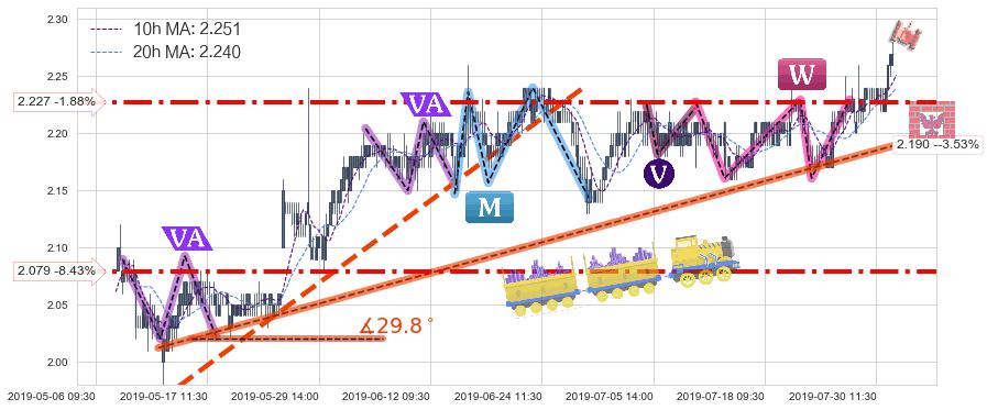 ♘ 在最后的上升阶段2019-05-10 14:00至2019-07-31 15:00存在 持续未破位的支撑位 ,支撑价格2.190,支撑可信任强度86.42%,其距离最后价格2.270相差 -3.53%