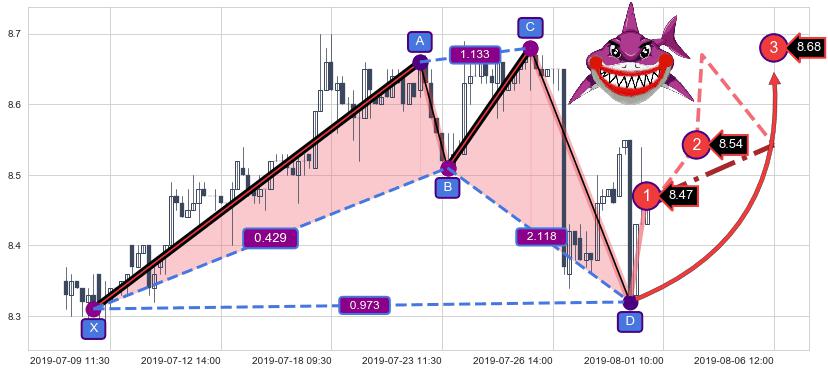 ➣ 谐波鲨鱼:c下跌到达d:猜想拉升 → 上涨 →【拐点】强支撑临近 → 大趋势均值回复