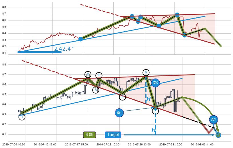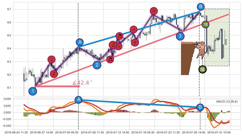 ✂️ 2019-06-25 11:30-2019-07-26 15:00上升趋势存在反转[风险],其原上升趋势的支撑位(8.66)已破位[强阻力信号],原上升趋势角度: 42.4˚