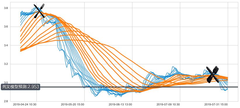 ➣ 90小时均线于(07-24 14:00: 3.079)形成【死叉】基于【死叉历史模型】预测死叉后最低波谷价格: 2.923, 死叉后最低价格2.910,虽然已经到达预测最低波谷价格,但耗时间很短动能很强, 预期继续下跌