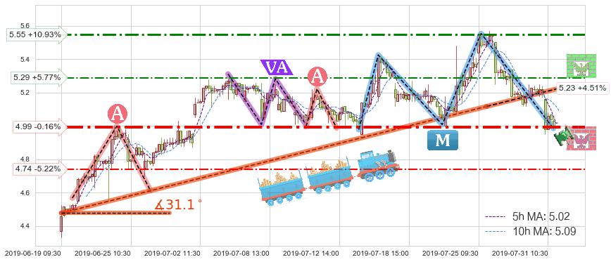 ♘ 阻力价格位5.29,可信任强度48.38%,距离最后交易2019-07-31 15:00形成的收盘价格5.00相差 +5.77%