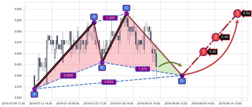 ➣ 谐波蝴蝶:b下跌接近c:猜想支撑性拉升 → 上涨 →【拐点】支撑临近 → 大趋势均值回复