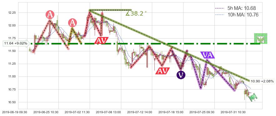 ➢ 预测:2019-08-06 14:00,【继续下探】稳定目前下跌趋势的前提下,预测价格:10.39