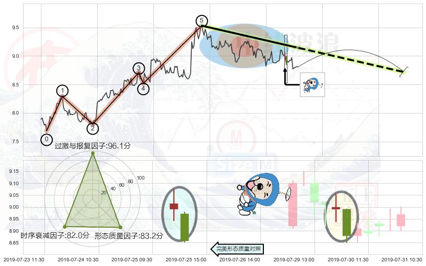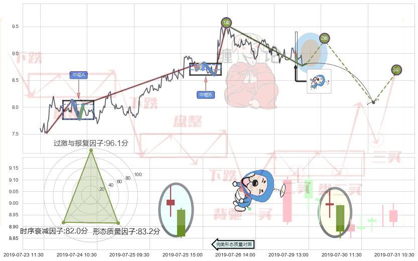 从2019-07-11 13:00至2019-07-31 15:00,共包含87个小时,阶段股价下跌-7.56%,阶段股价变动位移路程比: 1 : 6,下跌趋势角度: 30.3