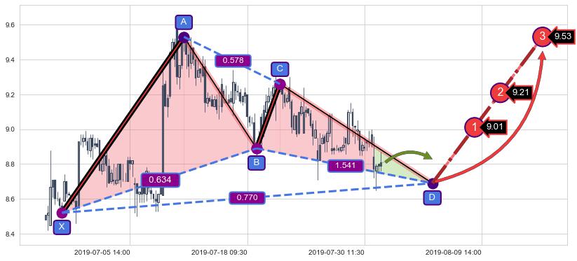 ➣ 谐波伽利:c下跌临近d:猜想拉升 → 上涨 →【拐点】强支撑临近 → 大趋势均值回复