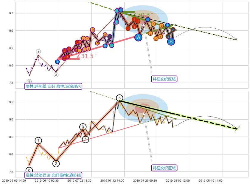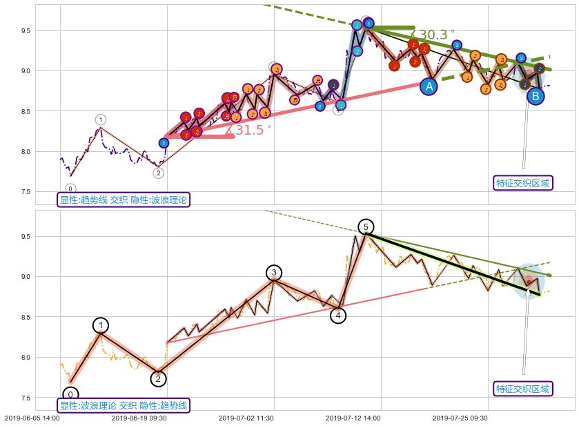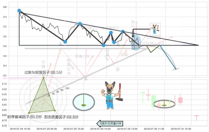 从2019-07-11 13:00至2019-07-31 14:00,共包含86个小时,阶段股价下跌-7.56%,阶段股价变动位移路程比: 1 : 6,下跌趋势角度: 30.3