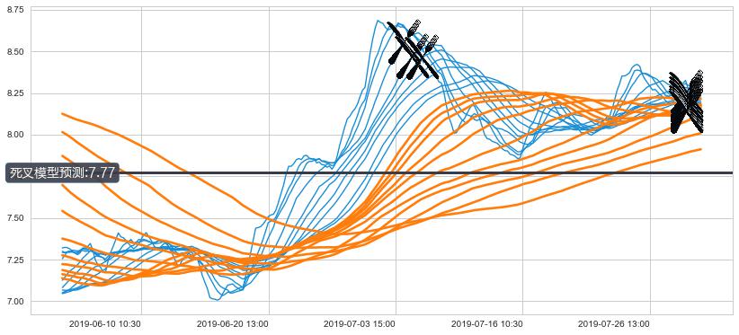 ➣ 70小时均线于(07-30 15:00: 8.17)形成【死叉】基于【死叉历史模型】预测死叉后最低波谷价格: 7.72, 死叉后最低价格8.03,尚未达到预测最低波谷价格, 预期继续下跌