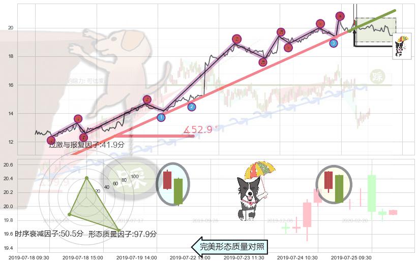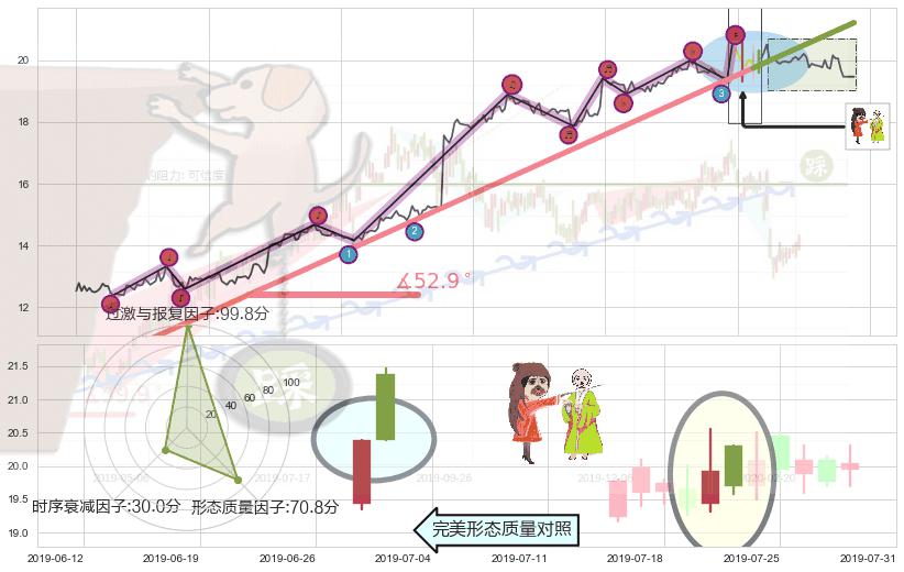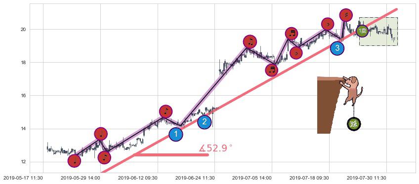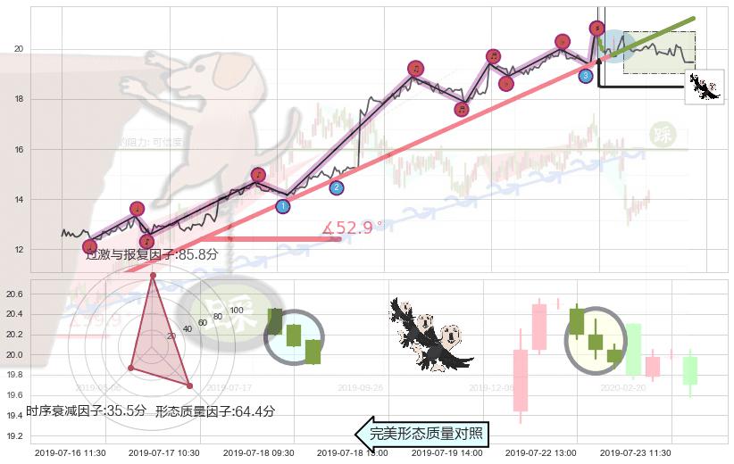 从2019-05-23 09:30至2019-07-23 13:00,共包含250个小时,阶段股价上涨47.88%,阶段股价变动位移路程比: 1 : 4,上涨趋势角度: 52.9,2019-06-25 09:30向⇪形成缺口,跳空上涨+14.92%