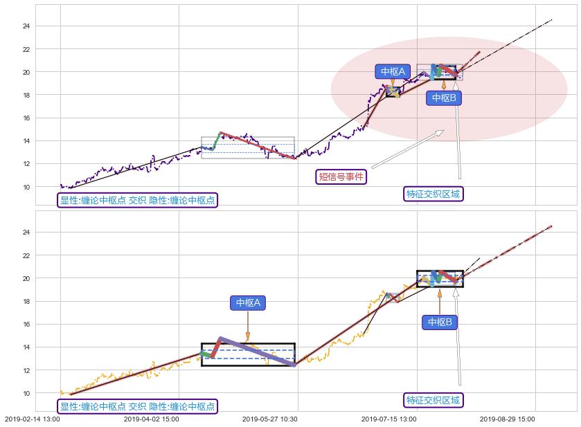 ➣ 缠论中枢点:猜想突破中枢B后持续拉升 → 上涨 → 突破中枢B阻力 → 持续趋势跟踪