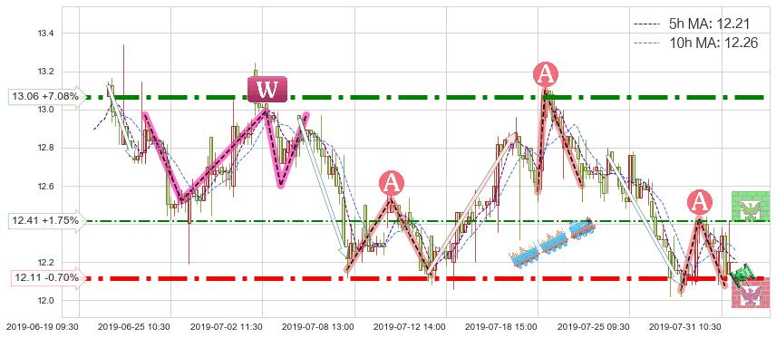 ♘ 支撑价格位12.11,可信任强度94.91%,距离最后交易2019-07-31 15:00形成的收盘价格12.20相差 -0.70%